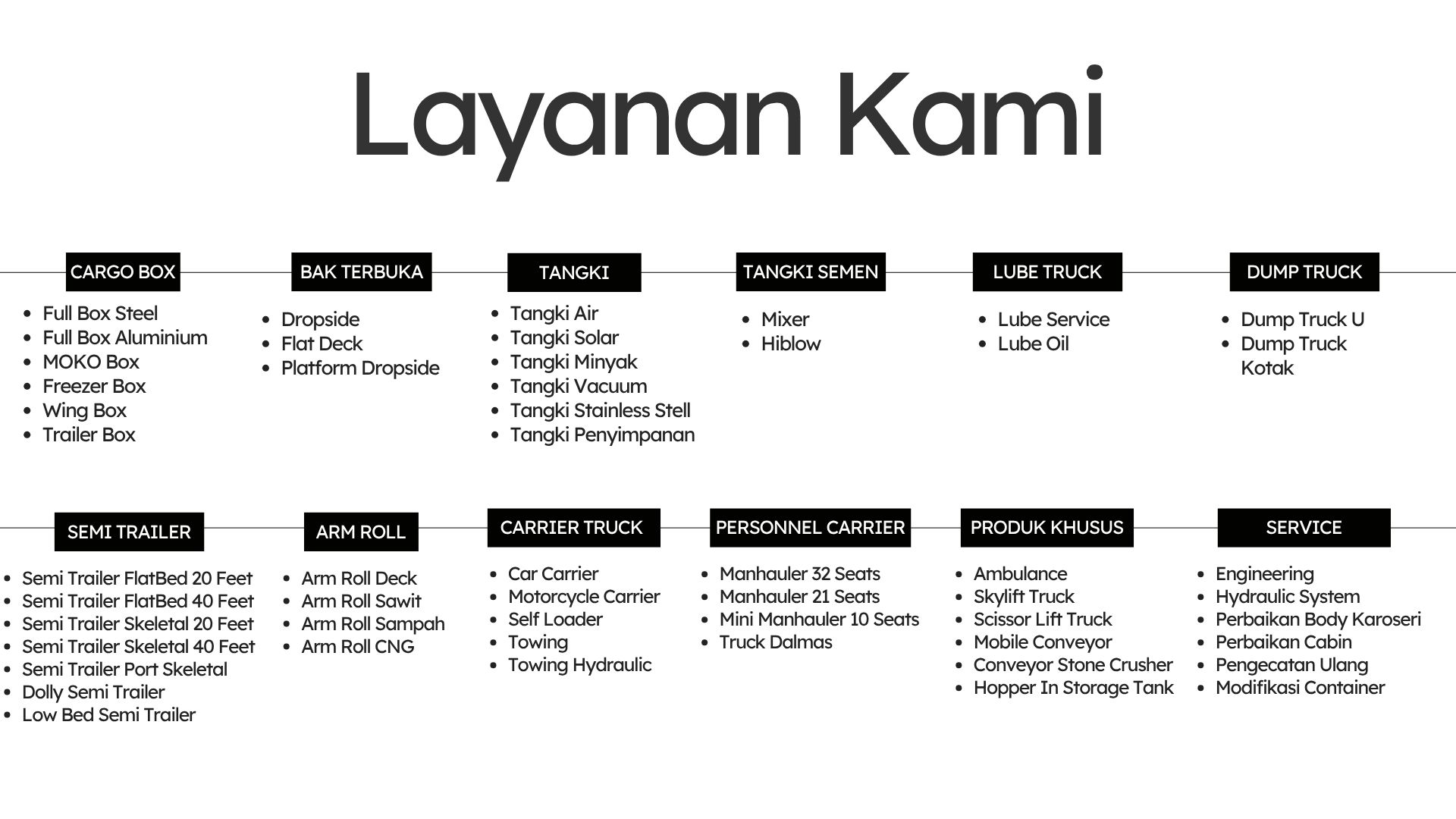 Cargo Box Aluminium/Steel, Arm Roll, Dump Truck, Crane, Wing Box, Lube Service, Modifikasi 4×4, Modifikasi Double Cabin, Trailer, Self Loader, Manhauler 32/21 Seats, Mini Manhauler, Tangki Vacuum/Air/Solar/Minyak/Gas.hingga berbagai kendaraan khusus lainnya.